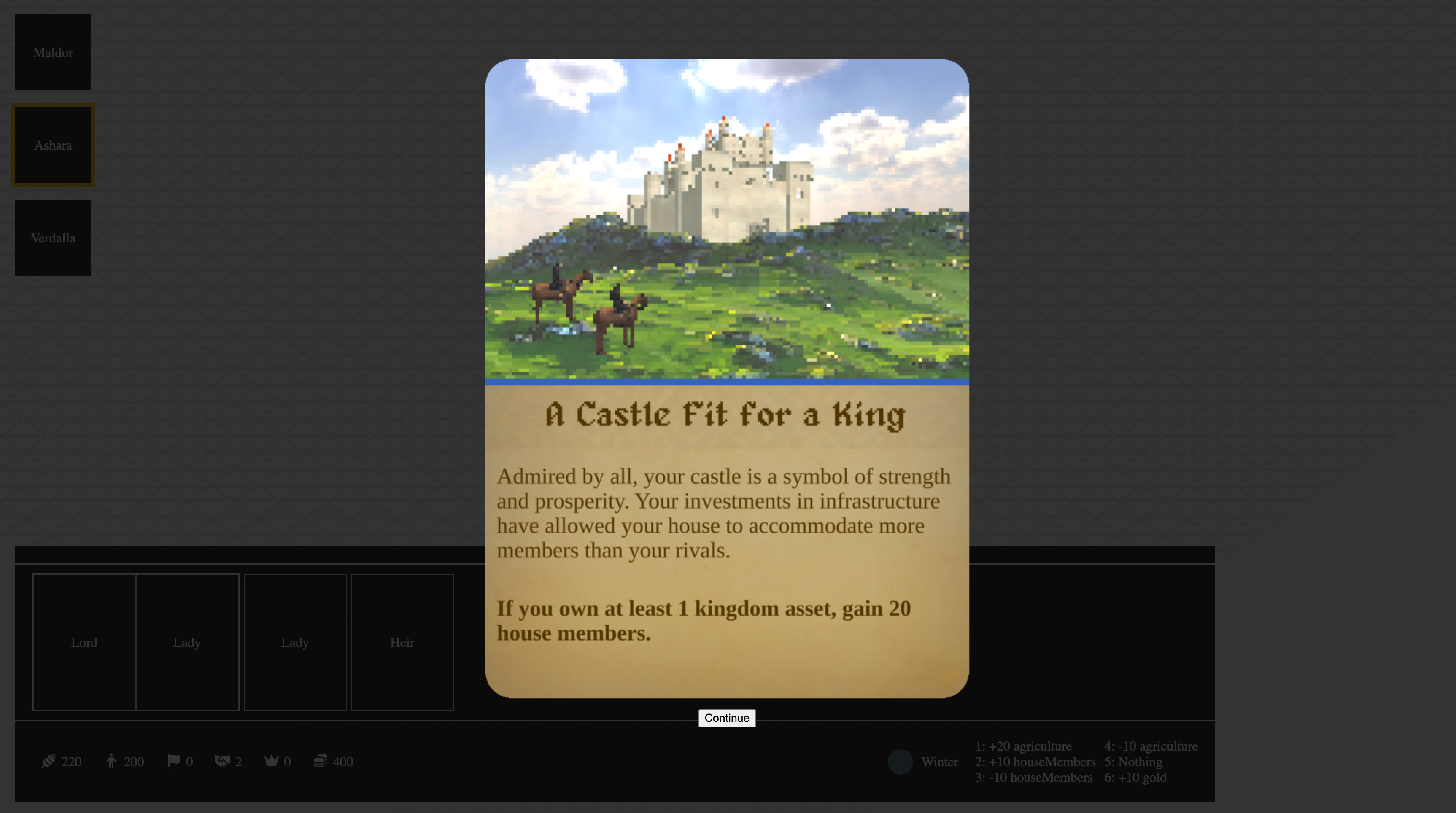 We also worked on one of the core mechanics tied to dice rolls. Each turn, the dice is rolled and players receive resources based on the result and the territories they rule.