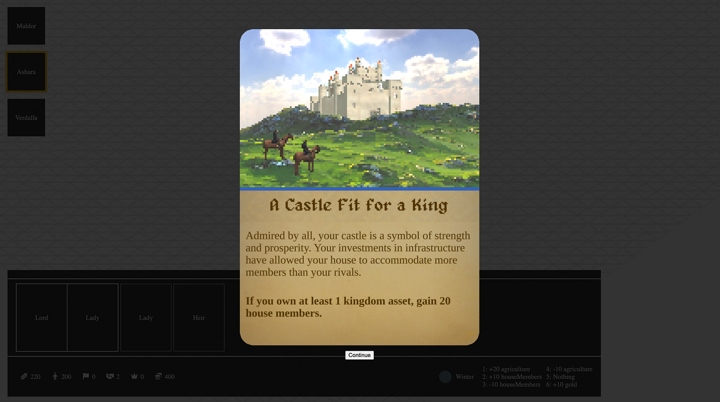 Our main focus this week was building the events mechanism. In our game, events can occur that can either affect the current player or everyone.